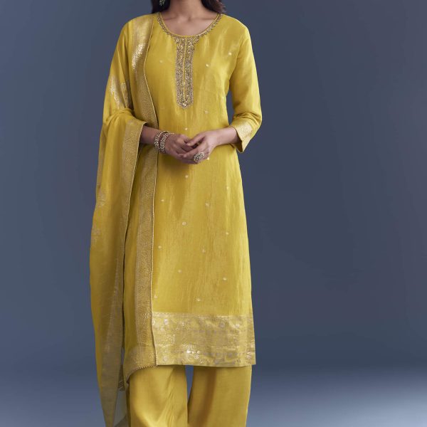 Yellow Tissue Palazzo Suit With Zardosi Embroidery