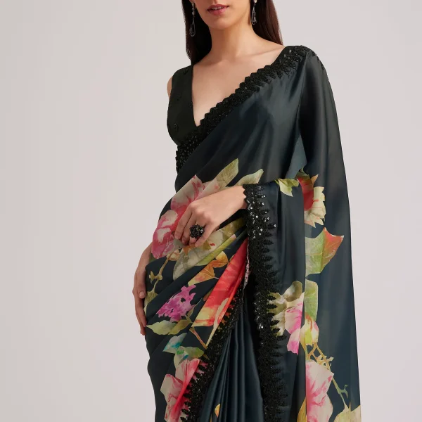 • Midnight Blue Satin Woven Saree With Delicate Hand Embroidery ₹7,995.00